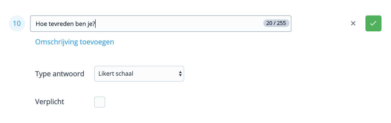 Met de Likertschaal vraag kun je de tevredenheid over een onderwerp uitvragen. Deze vraag kun je ook met de buttonvraag maken maar omdat deze vraagstelling veel voorkomt hebben we ook dit specifieke vraagtype ontwikkeld.
