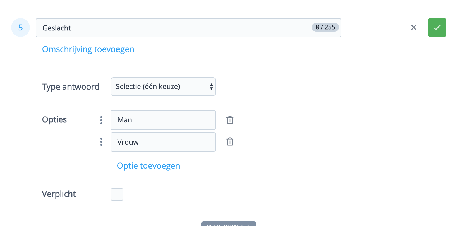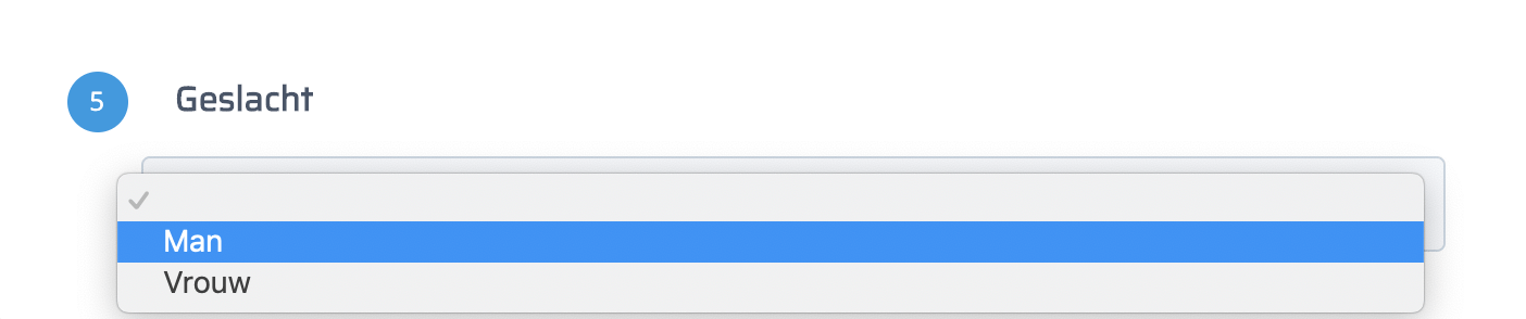 Met de selectievraag geef je de gebruiker de mogelijkheid om één keuze te maken uit meerdere voorgedefinieerde antwoorden. Er wordt een dropdownlijst getoond waarmee de selectie gemaakt kan worden.