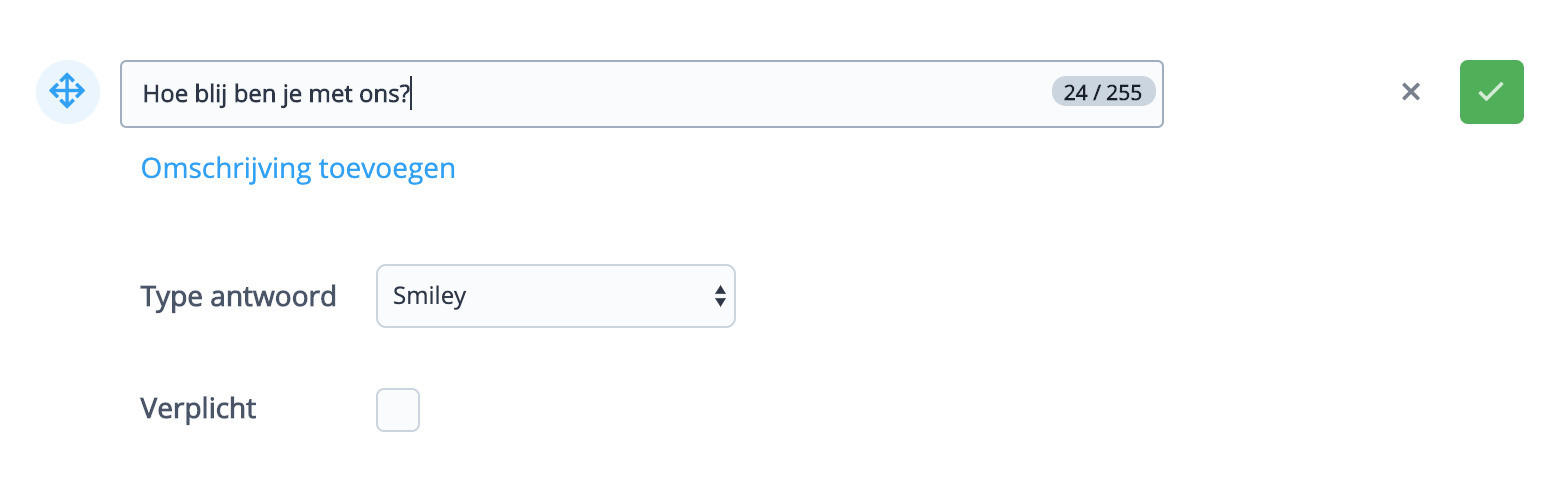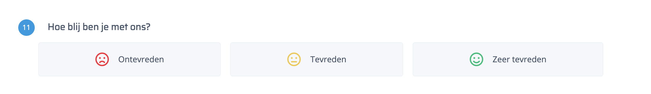 Laat jouw klanten met een gevoel uitdrukken met smileys. Deze vraag toont drie gezichten van niet-blij, neutraal tot blij.